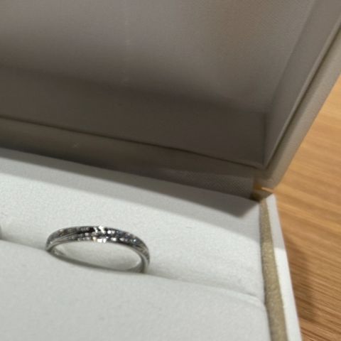 シンプルで繊細なデザイン性が好みでした。 リングの細さも選んで指に合うものができました。 シルバーではなく、肌に馴染みやすいホワイトゴールドの色味にしたところもこだわりました。 指輪の内側に入籍日の刻印をしたところ。