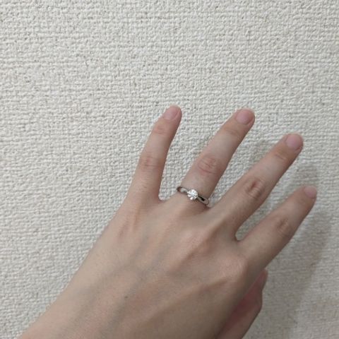 指輪の真ん中がくびれていてリボンのような形で可愛いです。真ん中にダイヤモンドがひとつ付いていて、王道の婚約指輪のデザインでダイヤモンドの綺麗さが引き立っていて気に入りました。ダイヤモンドの品質もとても良いです。