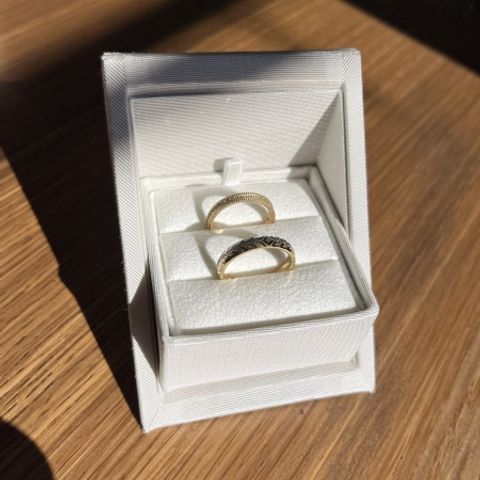 全てのデザイン素敵だったのですが、縁のデザインが特にきにいりました。ピンクゴールドのラインが入ったデザイン、マット加工がとくにお気に入りです。二つの指輪がお揃いデザインだけど、それぞれの特徴もあります。
