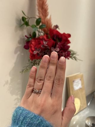 シンプルだけどこだわりがあってとても可愛いです。桜が好きなので、このデザインは自分たちにぴったりだと思って選びました。リングの色はとても迷いましたが、婚約指輪はピンクゴールドで、結婚指輪はシルバーにしました。重ねづけするとより可愛くてテンションがあがります。
