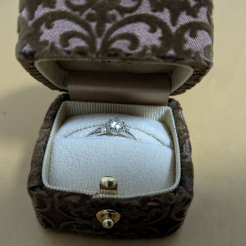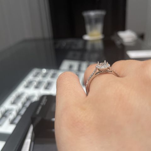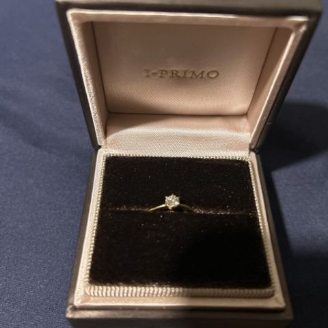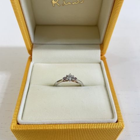 憧れの婚約指輪ということで、好きを詰め込んだデザインです。大粒の真ん中のダイヤが目を引くデザインで王道感があると思っています。また、真ん中のダイヤの横に2つダイヤがついていて更にゴージャス感があります。