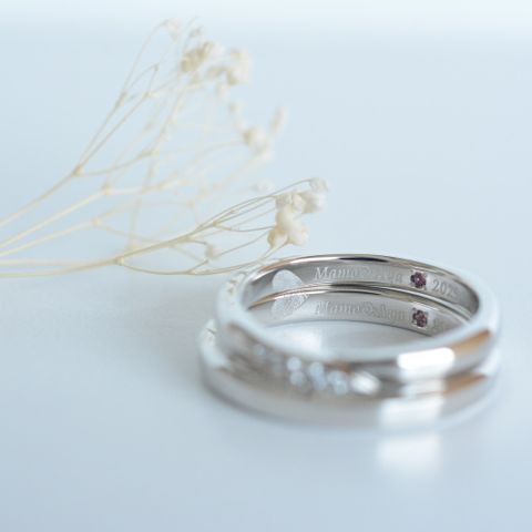 2人でオリジナルの指輪を低価格で作れたのが良かった。 指輪の素材もお互いの好みの素材して、デザインも一緒に考えたペアリングです。 裏にお互いの誕生石を相手の指輪に入れて、イニシャル、結婚記念日を入れました。