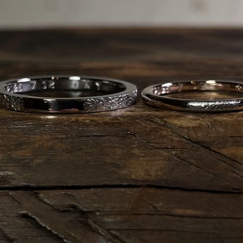木目と刻印によって自然を連想させるイメージに仕上がっている。 ひねりが入ってるのでマリッジリングとしてオリジナリティが一層引き立ち、普段使いからドレスアップまで幅広く付けていられるものに仕上げていただきました。