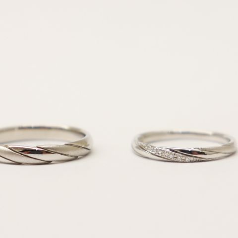 王道のストレートリングに見えて、側面が斜めに加工されているので、ちょっと違ったニュアンスのリングを探している方におすすめです。 ニュアンスの違う部分には、つや消しの加工やミル打ちなどもできます。 女性用の方はダイヤの数もカスタマイズできます。 土台は揃えて、それぞれの好みも反映できます。 婚約指輪との重ね付けがしたかったので、ストレートであれば婚約指輪の形も選ばず、馴染みが良いです。