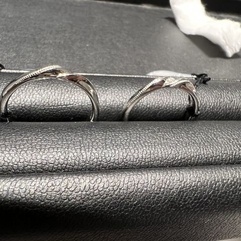 唯一無二のデザインに2人してひとめぼれでした ミル打ちといったドットの様なデザインがあしらわれてて高級感◎ 指輪はウェーブですがウェーブ過ぎずストレートに見えてちょうどいいライン もってる婚約指輪との重ね付けの相性もよくて最高でした そのあと何個か試着しましたが結局これが忘れられずに決定