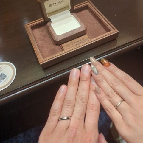 それぞれ自分の手に馴染む色味を選べて、デザインもそれぞれの好みに合わせて かつさりげなくペア感のあるものに仕上がったので満足しています。 特に憧れだったミル打ち加工と、夫は周囲に気づかれにくい下側に 私は周囲にも見える上側にスターダスト加工を入れたところがお気に入りです。