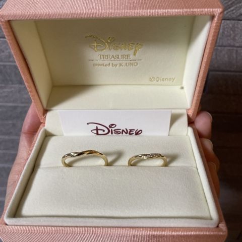 シンデレラがイメージされたデザインの指輪です。 内側にガラスの靴も彫られていて可愛い! 波打つデザインで、女性の方にはダイヤモンドが3つ入っており輝いています♪ オーダーで、ゴールドにもしていただき、毎日つけるのが楽しみなしで仕方ありません!