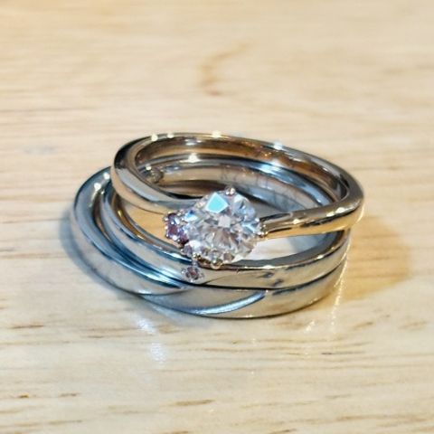 普段使いが出来つつ、じっくりみると見惚れる不思議な魅力を持つ指輪だと思います。婚約指輪はダイヤモンド周りにデザインがないからこそ主役のダイヤモンドに目が行きます。結婚指輪は、シンプルでウェーブ(上下)があり表面加工で遊べます。