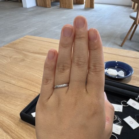 付け心地がとてもよくて曲げたり握ったりしても違和感がないところ、シンプルの中でもデザインがあってキラキラを追加したりマット加工に変更できたりと自分たちだけの特別な結婚指輪を購入することができるところがまだとてもおすすめ