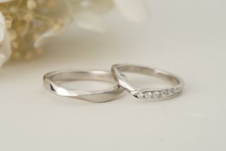指輪のオーダーメイドで、お店の担当の方とデザインを一から決めていき、理想の指輪を手に入れることができました。 妻は他のお店にはあまりない、S字型でダイヤが両サイドに分かれてあしらわれたデザイン、夫は表面にヘアライン加工を施したデザインにし、夫婦それぞれ自分の理想の指輪をつくることができて満足です。