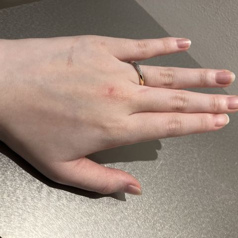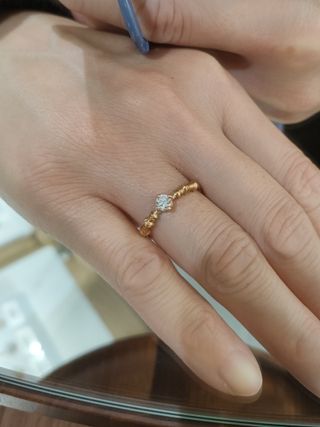 横から見るとピンクゴールドの薔薇のモチーフがチラッと見えて、さりげなくて可愛いです。 細めの指でもダイヤが大きすぎず小さすぎず、よく馴染みます。 指輪のサイズが何回でも0.5刻みで調整が可能で助かりました。