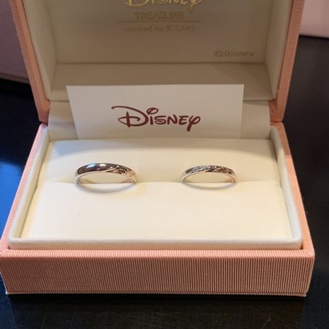 イエローゴールドがデフォルトなのですが、男性はそのまま、女性はピンクよりピンク味の強いローズゴールドにしました。 男性のリングはシンプルでしたが、互いに彫りを入れてもらい、デザインをこだわりました。 また、裏にもディズニーの刻印や、日付等をいれてもらい、世界に一つのオリジナリティに溢れたリングになりました。