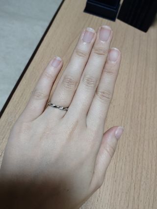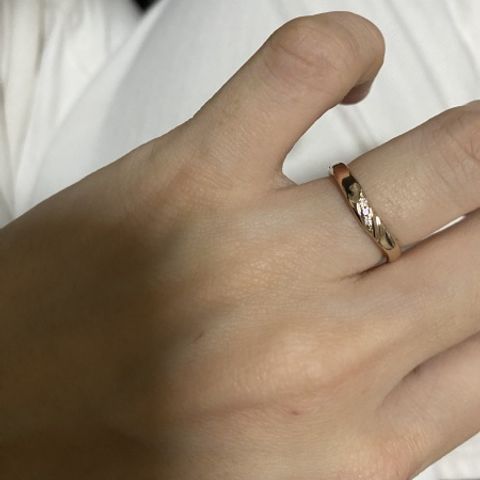あまりリングが太いのが嫌でしたので、今回の細目リングに出会えて嬉しかったです。また、ダイヤが少し斜めについているところもお気に入りで、ダイヤのかがやきも他ブランドに比べて良く、とても満足しております。