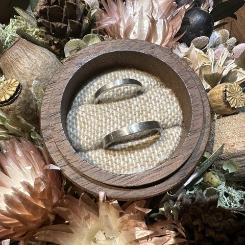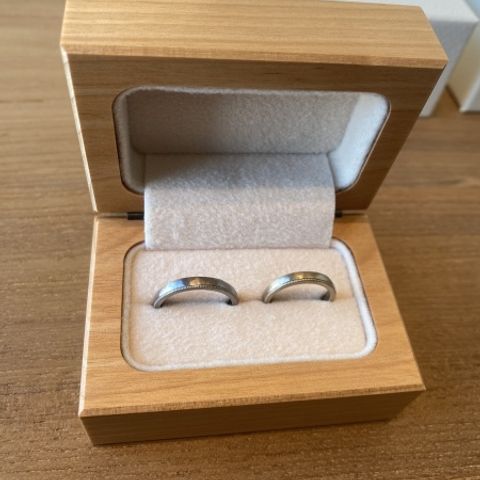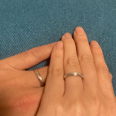 ペアでも素材を変えて作れたところ。男性用はほんの少しウェーブがあり、女性用は大きめにウェーブが入っているのが可愛いです。 お揃いの指輪でもちょっとづつ違ってもお互いに馴染む形にできたので満足しています。