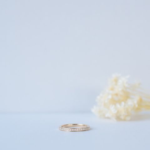 デザインはハーフエタニティで、色はオプションのブラウンゴールドにしました。相手の指輪のサイズが確かではなかったので、サイズ調整のできないフルエタニティではなく、ハーフエタニティにて作成しました。内面に刻印や誕生石など入れられるとのことでしたが、なるべくシンプルにしたかったので何も入れていません。