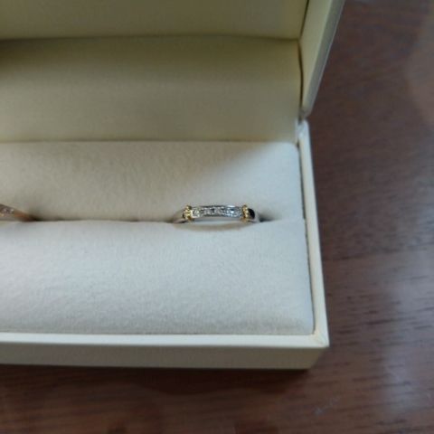 2色使いでデザインがかわいくて気に入りました。 プロポーズでもらったリングもケイウノのものだったので、重ね付けができるようなデザインを探していました。 V字のようになっていたので、婚約指輪との相性も良くとてもよかったです。