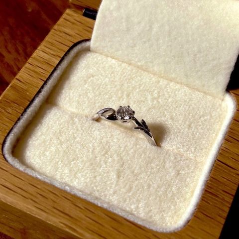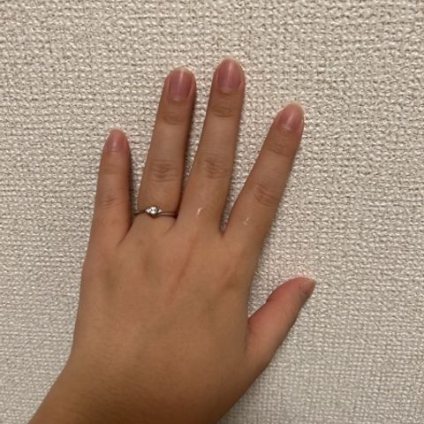 ダイヤモンドの質の高さと、リングは華奢に見えるが、指が綺麗に見えるところがオススメポイントです! 婚約指輪だけでつけることは少ないと思うので、結婚指輪と重ね付けすると、さらに綺麗に映えるように選びました!