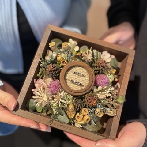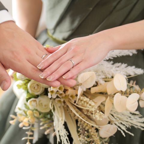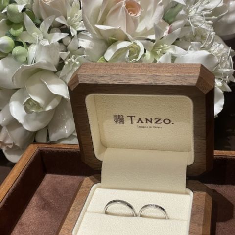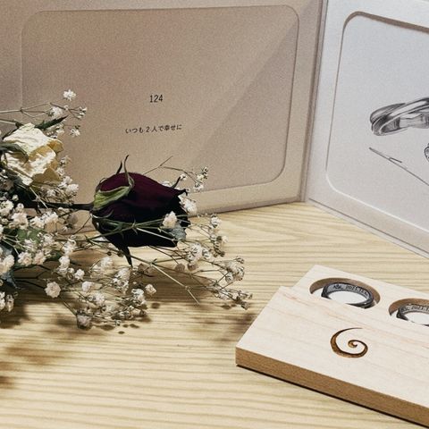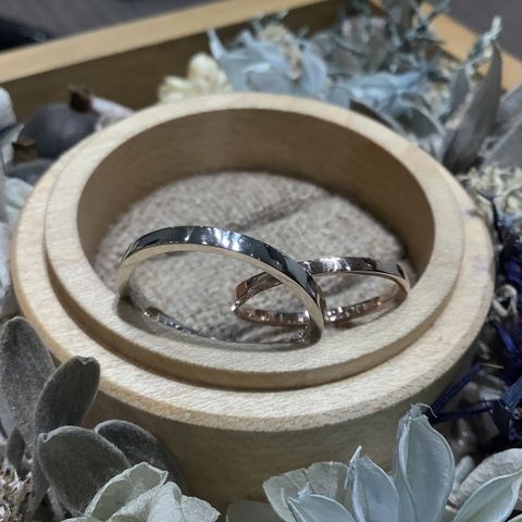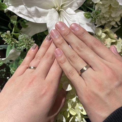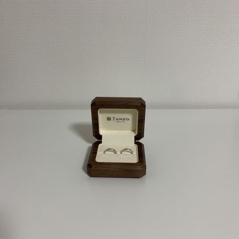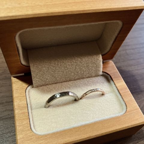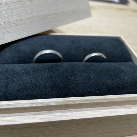 お互いマットな質感が好みだったので、梨地加工で個性的ながらも落ち着きと温かみのあるデザインにしました。 内側の刻印も自由度が高くて楽しく決めることができました。指輪の形もストレートとS字でお互いの好みを反映させました。 価格も良心的だと感じました。
