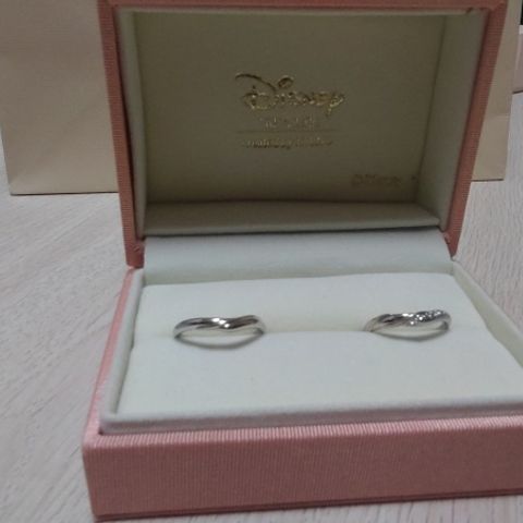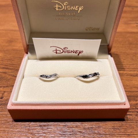 新婦がディズニー(特にミッキー)が好きなのでミッキーでオーダーメイドできるお店で作りました。二人の指輪で波打ってる様にゴールドの流れが入ってるのが良いかなと思います。また見る人が見ればミッキーとわかるけどいかにも「ディズニーのものです!!」と主張していないさり気なくミッキーがいるのも良いかと思います。