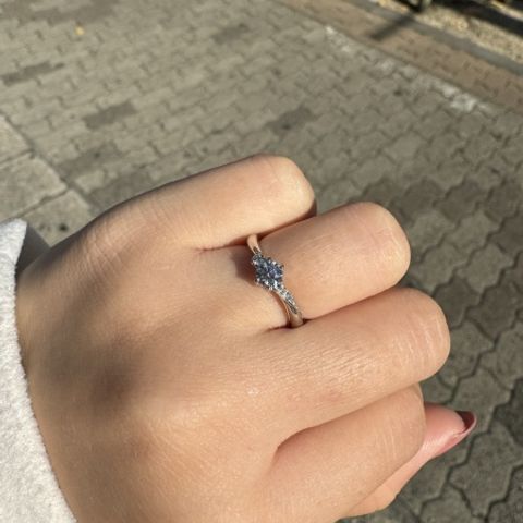 中心のダイヤの周りにも細かなダイヤが輪っかになっていて、中心のダイヤを含め大きなダイヤに見えるため、キャラット以上の輝きがある。またまとめていた、カラーとクラリティーにも出会い、価格帯も良く購入を決めました。