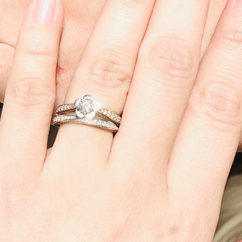 ダイヤの右と左でデザインが異なっており、アシンメトリーなデザインになっているところがとても気に入りました。少しウェーブになっている点も魅力的です。ダイヤを引き立ててくれる素敵なデザインで大変可愛いです。