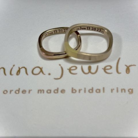 デザインはK18のクリア仕上げ、イエローゴールドとピンクゴールドにしました。 シンプルなデザインなのにピカピカでお気に入りです! 刻印も中にしてもらえるし、当日に持ち帰り可能です! (一部後日引き取りもあったような?)