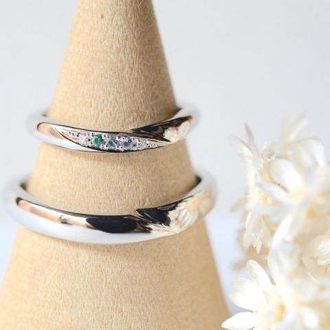 繋がりから始まり素材にこだわってつくりました。指輪が二つ重なったように見えるように艶消しと艶ありにしてもらい、私のは中心にアイスブルーのダイヤをいれました。小さいですがシンプルで素敵な指輪になりました。