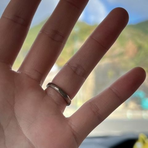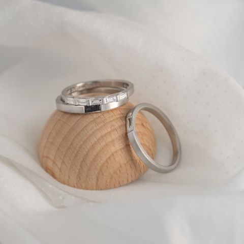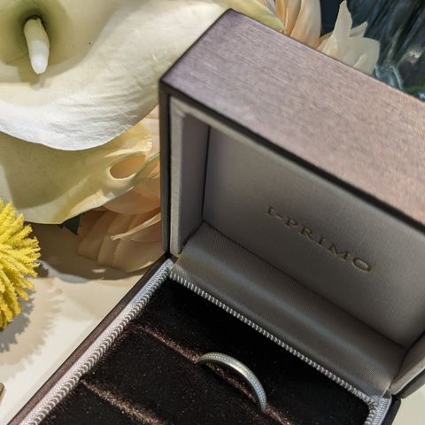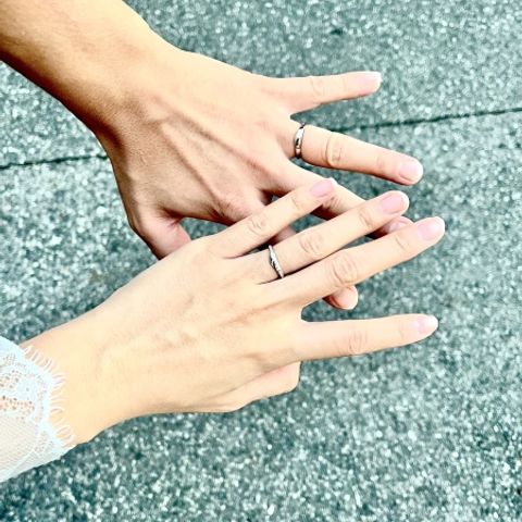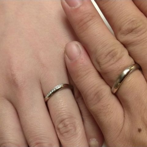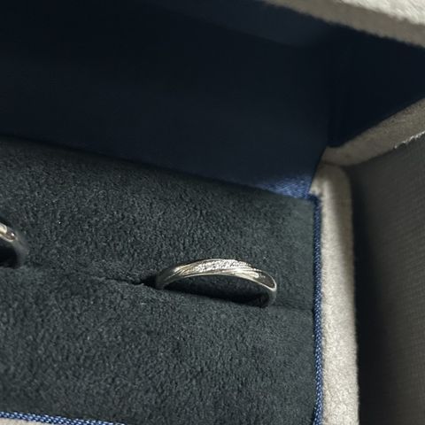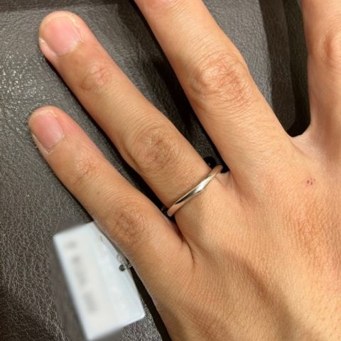 シンプルなデザインで仕事の関係で傷がつきやすいのでダイヤはないデザインを選びましたが、 質感の違いでダイヤが無くてもキラッと光るように そして、同じタイミングで購入した婚約指輪のダイヤの幅に合わせていただき重ね付けをした時に綺麗に揃うよう段差や幅の調節もしていただきました。 手のひら側に入れていただいた星とダイヤのワンポイントデザインもお気に入りです。