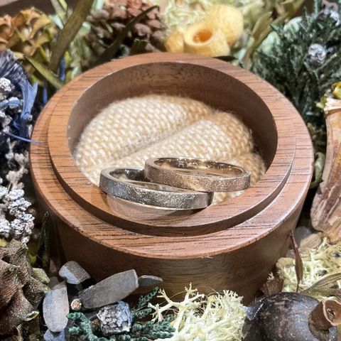 私はよく見るキラキラする指輪が自分に似合うか不安な中探していましたが、こちらの数種類から選べるテイストでキラキラ過ぎないマット過ぎない、自分に似合うものを見つけたので選びました。夫も指輪半分ずつの面でテイストを変えるように作って、気に入っているようです。