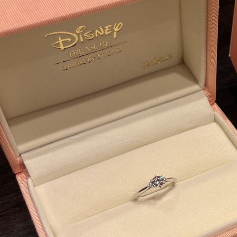 ダイヤモンドがキレイに映えていて、土台部分には実はミッキー、ミニーがいます。これはパッと見では分かりませんが実はディズニー好きの私たちにピッタリのデザインでした。セットで結婚指輪とつけれるのでとても嬉しいです!