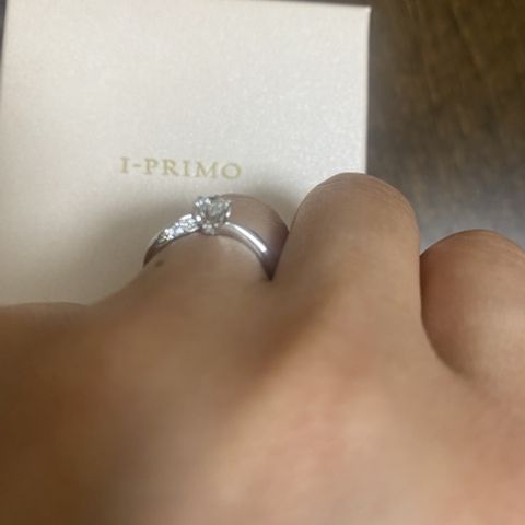 定番のシンプルなものではつまらないと思い、ダイヤが5つ並んだデザインの可愛らしい指輪を選びました。立体的で一段と輝きが綺麗に見えるところが気にいっています。サイドの緩やかなウェーブのお陰で指が綺麗に見えます。
