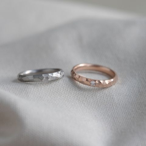 ヤスリで削った槌目模様のリングを手作りしました。 指輪の内側には手書きイラストと入籍日を入れました。 主人はプラチナ、妻はピンクゴールドで仕上げて貰いました。色味、見た目も希望通りに仕上がり満足しています。
