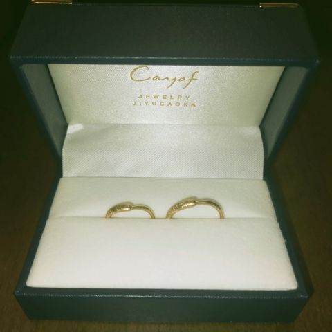 シンプルながら、金糸が一筋入るデザインと、製作過程で自分達も手を加えられる純糸結びを選びました。純糸結びは思いのほか難しかったですが、楽しく良い思い出になりました。 スタッフさんやデザイナーさんが丁寧に相談に乗ってくださり、両指輪とも、外側には妻の誕生石、内側は夫の誕生石を入れていただきました。外側の双子のダイヤモンドはさりげなくキラっと輝きます。内側は金糸の結び目とガーネットが入り、2人だけこっそり楽しめる、素敵な指輪を作って頂きました。