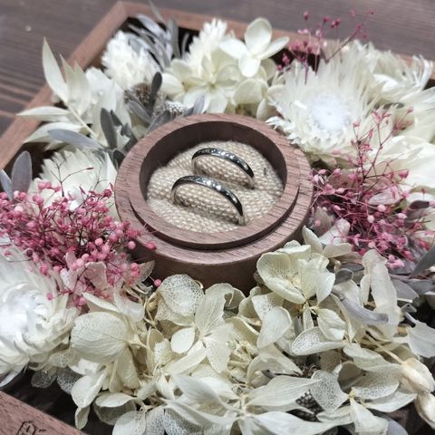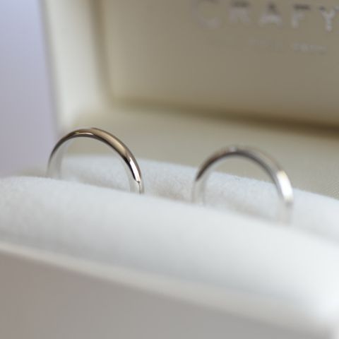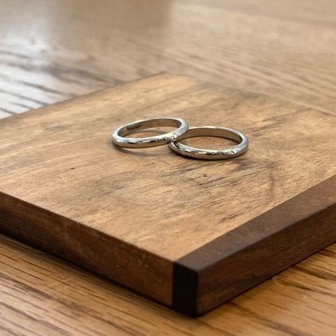 ホワイトゴールドとプラチナで制作。 形はどちらもシンプルに甲丸。 こだわったのは、素材と幅のみです。 指輪探しで色々なショップへ見に行きましたが、 結局シンプルがいちばんしっくり来たので、 手作りで特別感を出そうとこちらに決めました。