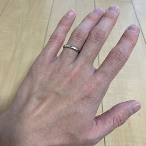 ・デザイン・テイストについて 永く着用することを考え、シルエット・デザインはシンプルにすることを重視しました。また、結婚指輪らしさ(フォーマル感)はある程度ありつつも、普段の服装や好みに合うカジュアルな雰囲気にしたかったため、ツヤ感を抑えた加工にしていただきました。上下の細かいミル打ちがお気に入りです。