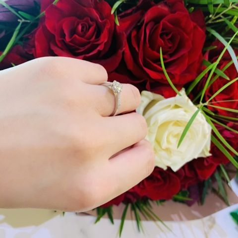 the婚約指輪という形です。最初はもう少し変わったデザインを…と思っていましたが、結婚指輪との重ね付けを考えてシンプルなものにしました。 リングがダイヤに向かって細くなっていて、指がとてもきれいに見えるところがお気に入りです。