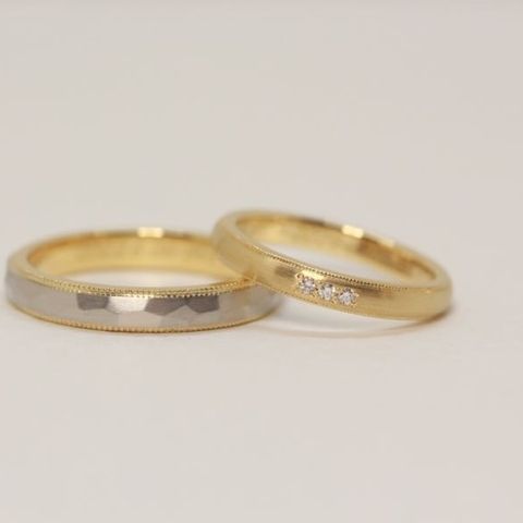 指輪のデザインはお互いの似合うカラーを選びました。ゴールドの方はダイヤモンドを入れて星留めをしてオリジナリティを出しました。また、ヘアラインという細い線がたくさん入った表面加工をし、少しアンティーク感も出したデザインにしています。