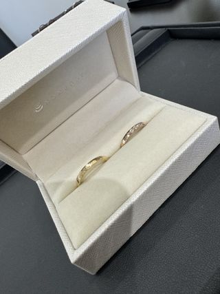 全く手作りとは思えない仕上がりでした。色んな金属から選ぶことも出来るし、デザインに関しても私は婚約指輪と重ね付けをしたかったのでそういったご相談にも応じていただき、婚約指輪とも非常に相性の良い結婚指輪の作成をすることが出来ました。今回は刻印を行っておりませんが、1年後、3年後、5年後といった節目に刻印や石を追加していく予定です。そういったカスタマイズができるのがとても素敵だなと感じています。
