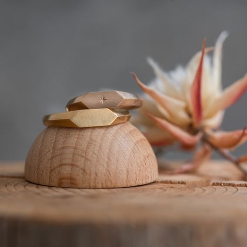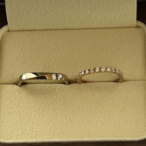 結婚指輪らしくない、ナチュラルに着けられる指輪にこだわりました。印台のあるデザインとブラシマットのテクスチャーで2人の希望を実現することができました。イエローゴールドとシャンパンゴールドで少し表情が変わるのも良いです◎