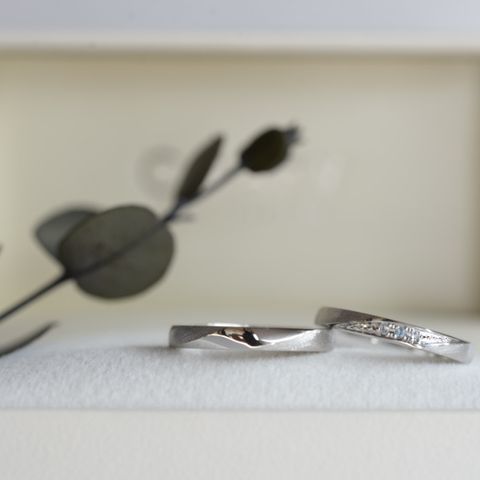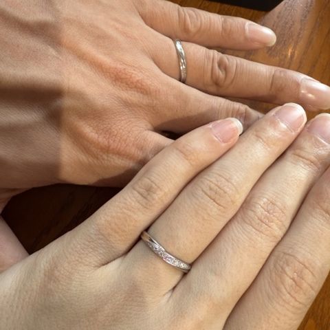 鍛造製法で作られており頑丈であるというところがまず気に入って説明を聞きました。その後、じっくりヒアリングしてくださりオーダーメイドで好きなデザインを作っていけました。他のブランドにも下見に行ったのですが、その時に夫婦揃ってウェーブが似合うと気づいたのでそのようなデザインにしました。マット加工も入れてよかったなと思います。