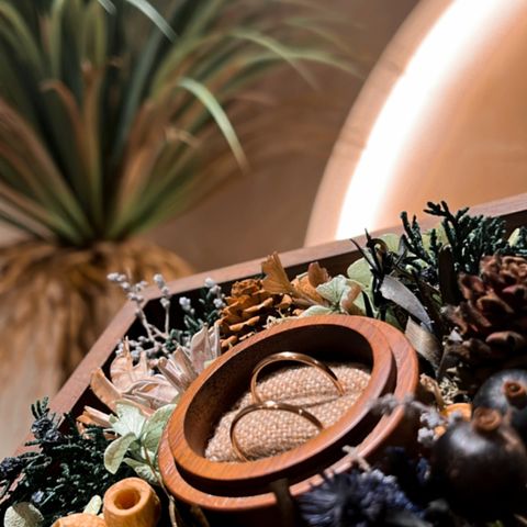 自分たちの唯一無二の木目を作ってもらえて、女性用のほうはダイヤを埋め込むことができるので色がグラデーションになるよう緑、黄緑、透明の順でこだわりました。もくめの柄もできる限り斜めになるようお願いしました。