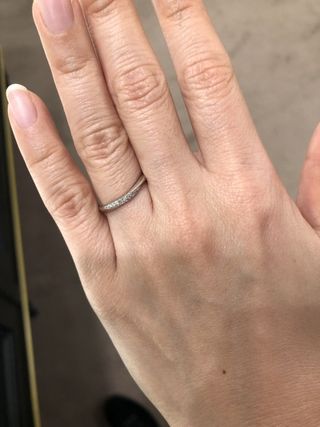 細かいダイヤが散りばめられており、光の反射でキラキラ輝いて綺麗です。色はピンクゴールドで可愛いです。サイズも入籍指輪で日常生活で問題ないかしっかり確認できていたので、結婚指輪の受け取りの時もぴったりでした!