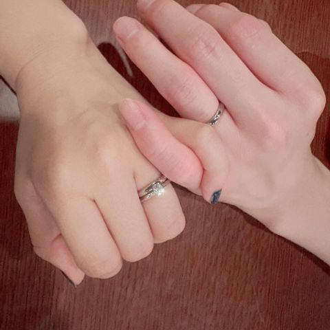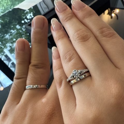 女性の方はダイヤのところが華やかでとても綺麗です。 形もウェーブになっていてハンド診断してもらった際オススメだったので馴染んでよかったです。 男性の方はマット加工してあったりウェーブにもなっていたりととても気に入りました。 この指輪は二つの星が揃うとき、ふたりの時間が動きだす。 「星時計」という意味があり北斗七星を表す7粒のメレダイヤモンドが輝き男性の指輪の方には内側に一粒のダイヤモンドがあるそうです。 ふたつリングを重ね合わせると時計のダイヤルのようにカチッと噛み合いひとつのシルエットに。 たとえ離れていてもお互いの存在を感じ、同じ時を刻み続けるふたりに。 という指輪に込められた思いも素敵だと思いこれからの私たちにいいなとおもい決め手になりました。