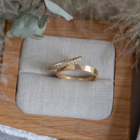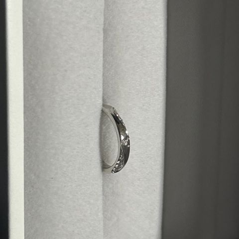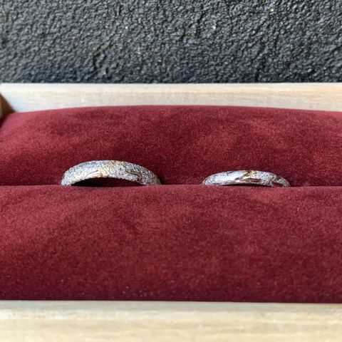 ハーフエタニティの指輪を検討していましたが、2人のお揃い感も諦めきれず、オーダーで作っていただくことにしました。 半周分はダイヤ、もう半周分はメンズリングとお揃いの槌目で作っていただきました。 シーンやファッションに応じて、キラキラしたエタニティリングと、カジュアルな槌目のデザインを使い分けられるのもとても気に入っています♪