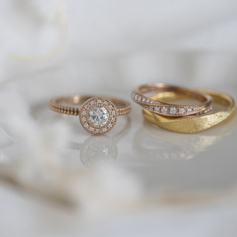 結婚指輪は、メビウスのモチーフを共通に、夫はマット加工、妻はメレダイヤをあしらいました。地金のカラーも肌に合うものをそれぞれ選び、肌に馴染み毎日つけたくなる質感になりました。 義父母の婚約指輪を活かしたエンゲージリングは、メレダイヤで囲い華やかなデザインを選び、ボリュームに負けないようアームにもデザインをつけて頂き、理想通りの存在感あるリングに仕上がりました。