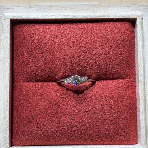 憧れの婚約指輪ということで、好きを詰め込んだデザインです。大粒の真ん中のダイヤが目を引くデザインで王道感があると思っています。また、真ん中のダイヤの横に2つダイヤがついていて更にゴージャス感があります。