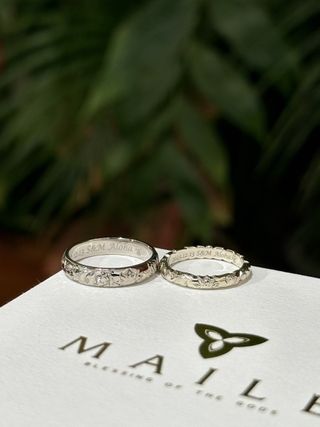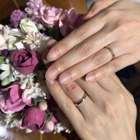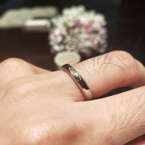 鋳造ではなく鍛造での製造で、簡単に傷ついたり歪んだりしづらいという質の高いものと聞き、毎日付けたままにする結婚指輪には最もふさわしいものだと思いました。 公式HPや店内のサンプルを参考にしながら、入れたいデザインをどのように入れたらよいかアドバイスをいただきながら決めました。 指輪のサイズやデザインも入籍指輪で試すことができ、満足いく指輪が完成し嬉しく思います。