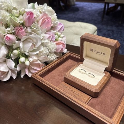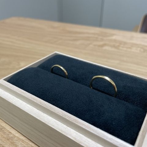 インスタでたまたま見つけたガラスのリングピローと組木デザインの指輪に一目惚れしました。夫と出会う前から自分の結婚指輪はここにすると決めていました。周りの友人とデザインが被ることもなく世界に一つの指輪で大満足です。