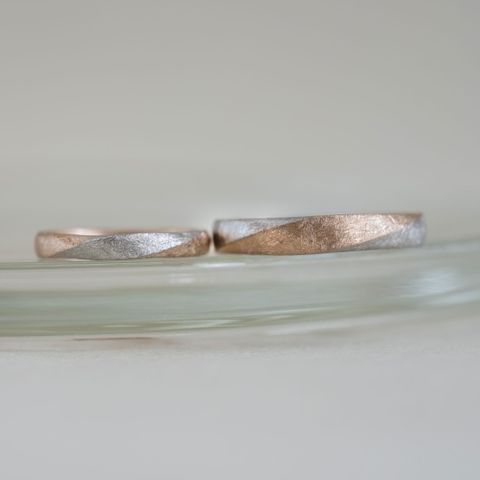 フリージアは捻れているデザインの指輪です。素材はプラチナとシャンパンゴールド、テクスチャーはダイヤモンドマットにしました。 素材の切り替えが美しく大変気に入っています。 2色なので気分や服装によって、指輪を回して付けてます。 飽きの来ないデザインだと思います。