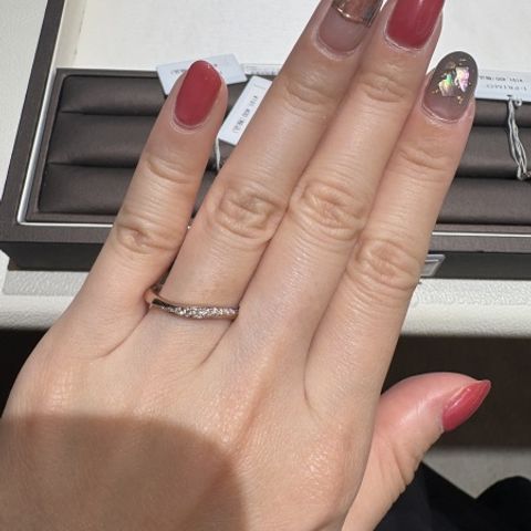 ウェーブ(V字)でエレガントな印象を受けたのと、ピンクゴールドがアクセントになっていて定番のデザインとは少し違う「自分たち好み、らしさ」を感じました。付け心地も良く、着用時の指の見え方もスッとしていて気に入っています。